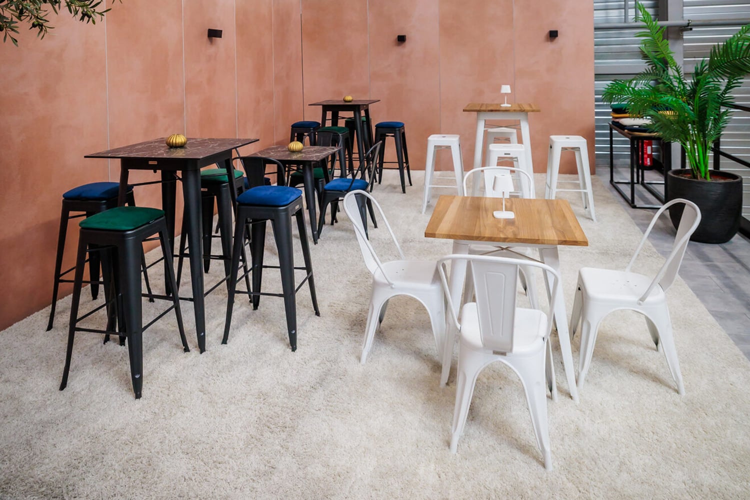 Die Sitzfläche, egal ob aus Kunststoff oder aus Holz, ist jeweils quadratisch und hat abgerundete Ecken. Die Bronx-Barhocker lassen sich schön in eine Reihe stellen. Hierbei kommt das markante Design des Barhocker ebenfalls schön zur Geltung.